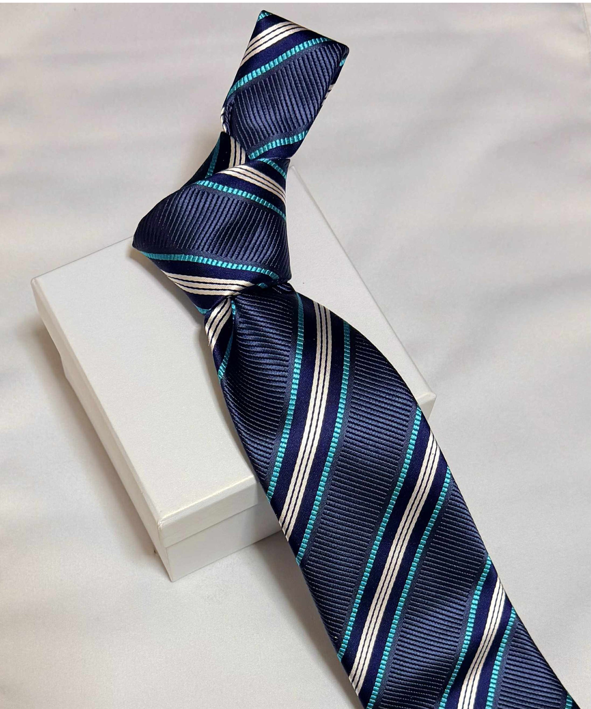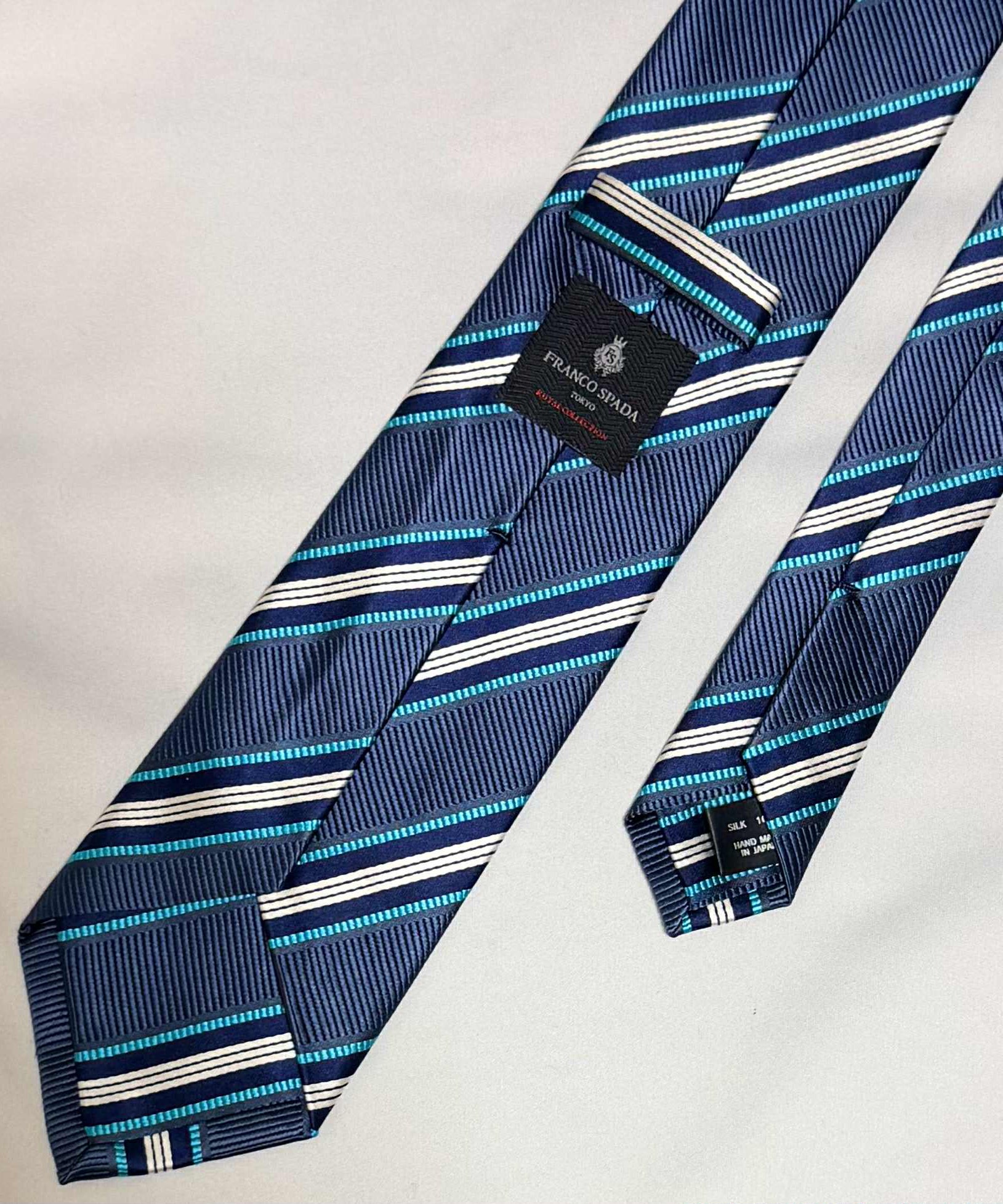 Franco Spada ( フランコスパダ )🆕コンテンポラリーブリティッシュレジメンタルストライプネクタイ:ブルーグレー×ネイビー×ターコイズ