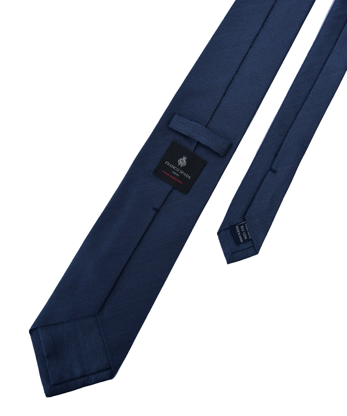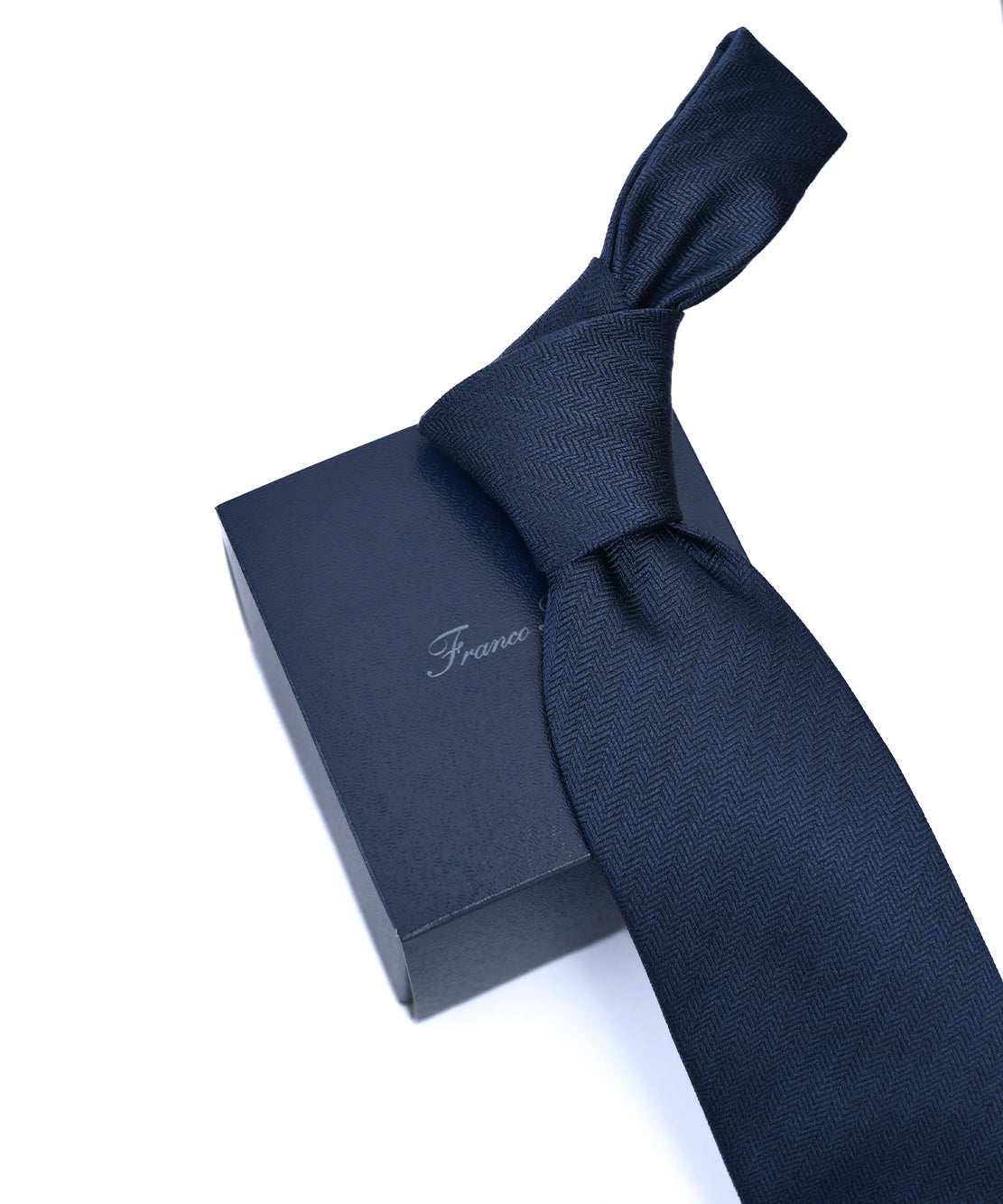 ミニヘリンボーンの地組織にフランコスパダオリジナルの緯糸で極細絹糸黒とトーン&トーンの2色の絹糸の3本を一緒に織り上げる事で繊細な深みのあるメランジ感を無地調で表現したハイクォリティで品のある大人のお洒落なネクタイです。