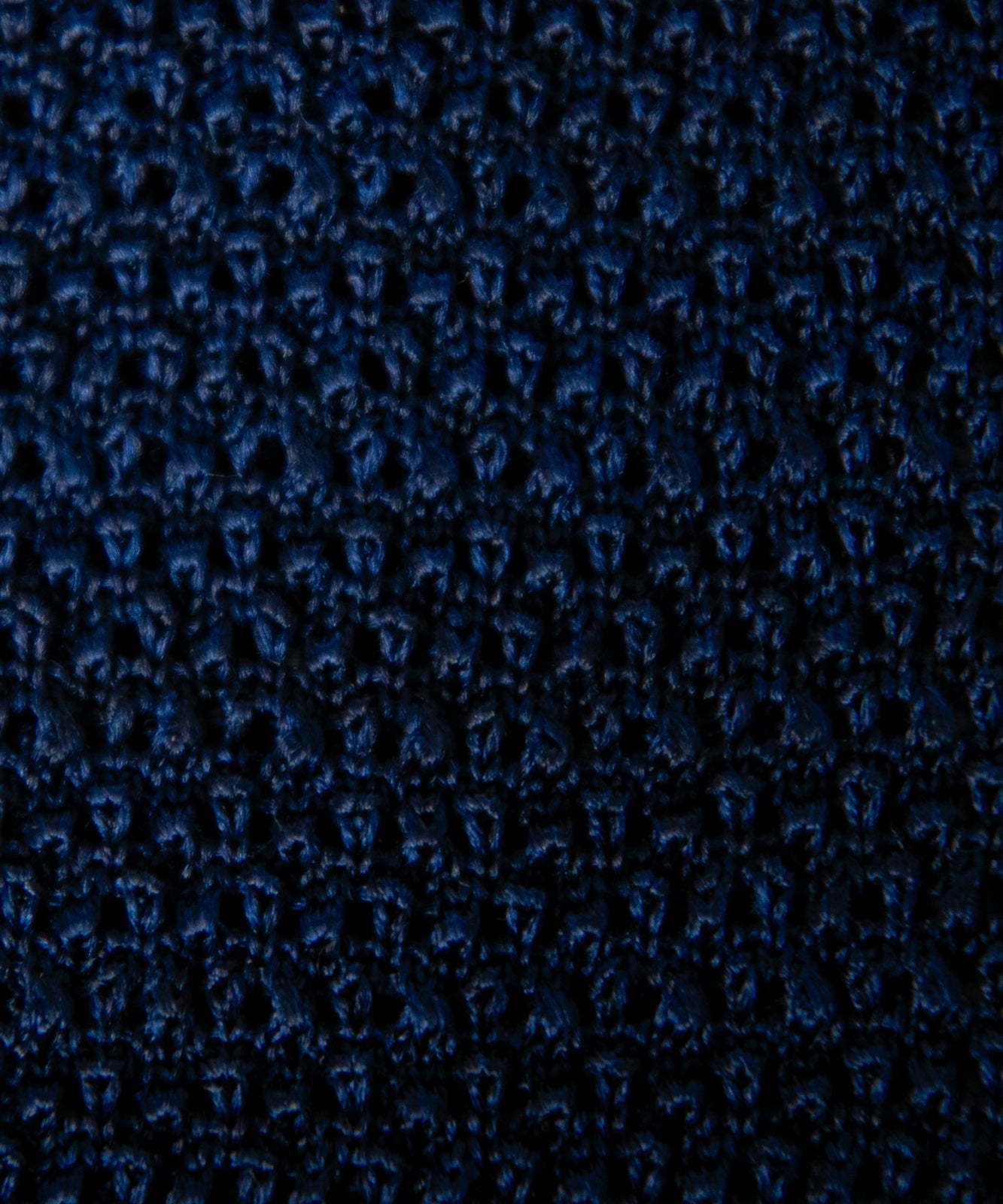 太番手絹糸のブラック×ダークネイビーの2色を組み合わせて緻密に丁寧に編み上げる事で、メランジ感のある深いダークネイビーの色味と絹鳴りのする格別のハイクオリティを表現しました。